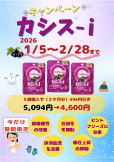 新お茶の水薬局では期間限定キャンペ-ンとして「カシス-i」を3袋購入で(2ヶ月分)、お値段 5,094円のところ4,600円にて販売中です。