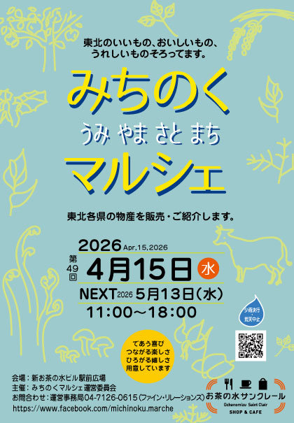 2026年4月15日(水)、東北の“いいもの・おいしいもの・うれしいもの”が集まる「みちのく マルシェ」を開催!東北各県の物産を販売・ご紹介する月に一度のイベントです。