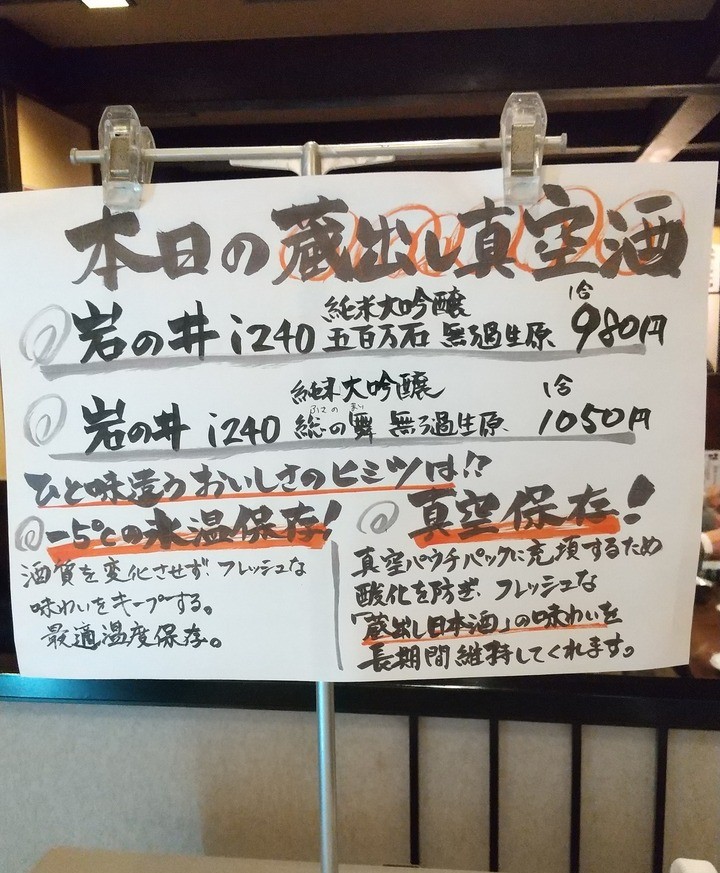 今なら純米大吟醸の「岩の井i240 五百万石 無ろ過生原 1合 980円」(期間限定)「岩の井i240 総(ふさ)の舞 無ろ過生原 1合 1,050円」(期間限定) の2種類を発売中です。